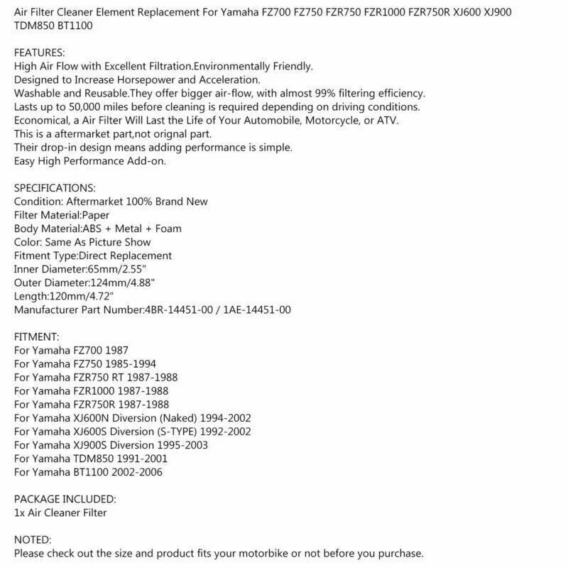Upgrade your Yamaha motorcycle's performance with our High-Performance Air Filter, specifically designed for the XJ600S, XJ600N, and XJ900S models from 1991 to 1999. This air filter enhances airflow, improving engine efficiency and throttle response. Its precision fit ensures optimal compatibility with your bike's engine, providing superior filtration to protect against dirt and debris. Experience enhanced styling and performance, making your ride smoother and more powerful.