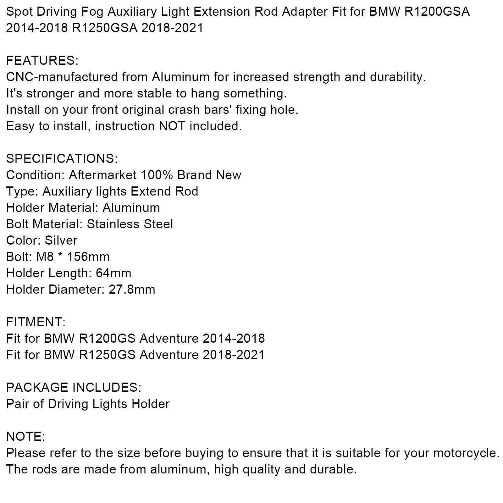 Enhance your riding experience with the Auxiliary Headlight Mount designed specifically for the BMW R 1200 GS ADV and R 1250 GS ADV models from 2014 to 2021. This robust mount allows for easy installation of auxiliary lights, improving visibility during night rides and adverse weather conditions. Crafted from high-quality materials, it ensures durability and stability, providing a secure fit for your additional lighting needs.