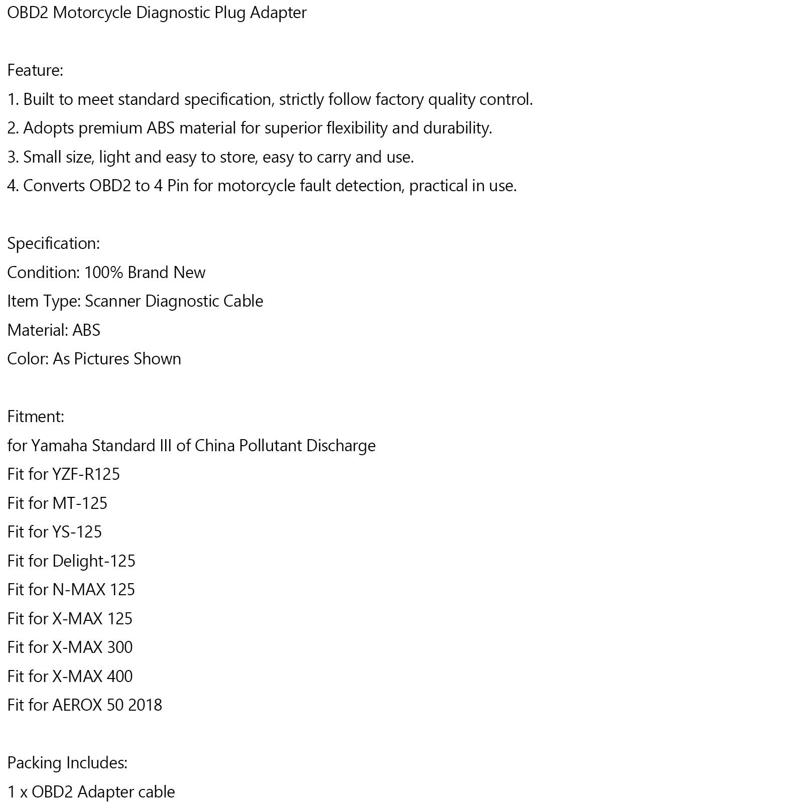 The 3 Pin to OBD2 Diagnostic Adapter Cable for Yamaha X-MAX (2018-2023) is an essential tool for motorcycle enthusiasts and mechanics alike. This high-quality adapter allows seamless connectivity between your Yamaha X-MAX and OBD2 diagnostic tools, enabling efficient troubleshooting and maintenance. Designed specifically for the X-MAX models, this cable ensures compatibility with both the 300cc and 400cc engine options, providing accurate diagnostics and performance monitoring. Enhance your riding experience by keeping your vehicle in optimal condition with this reliable diagnostic solution.