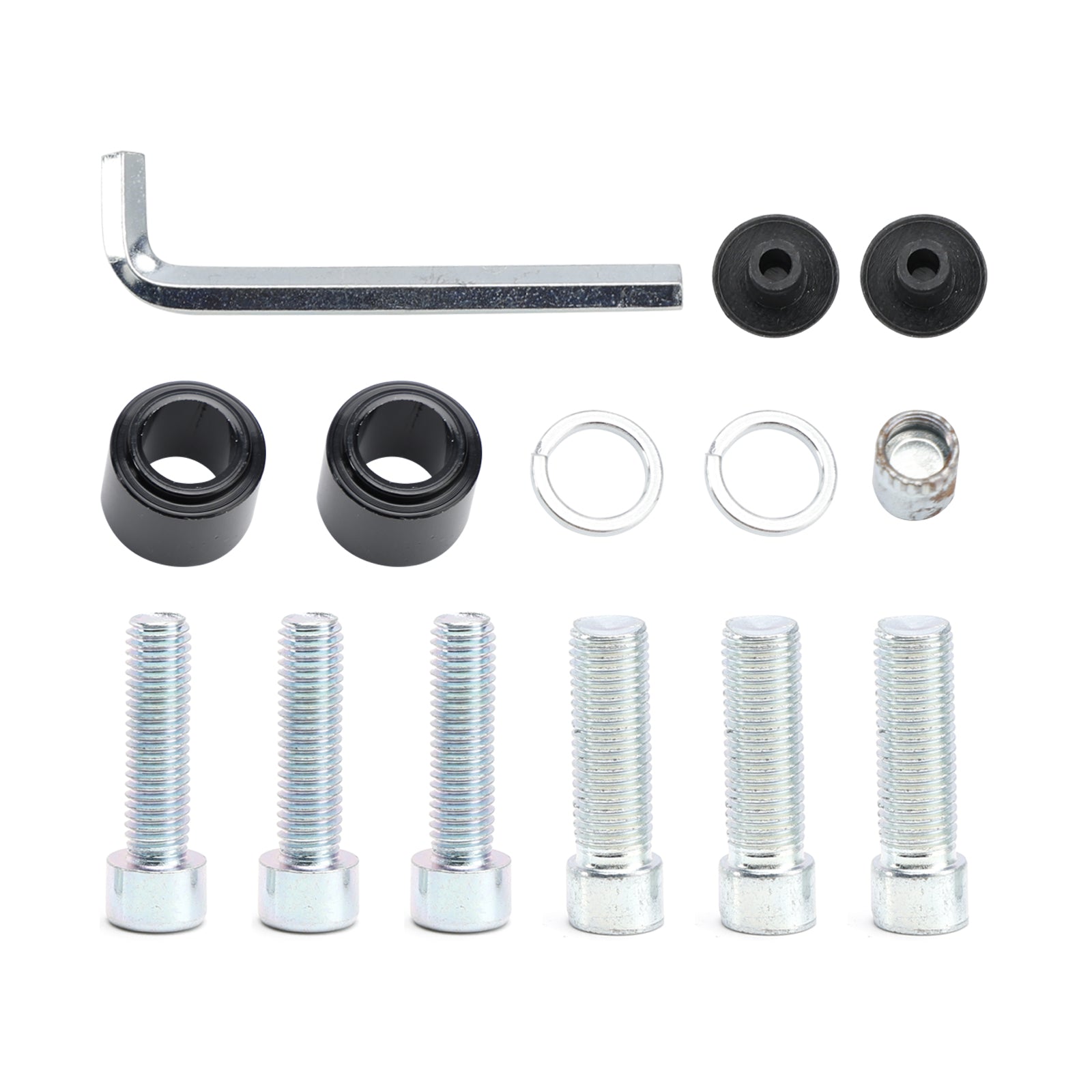 Included 2x right-hand M8x30 bolts, 2x Right-hand M10x30 bolts, 1x left-hand M10x30 bolt, 1x right-hand M8x30 bolt, collars and mirror hole caps.